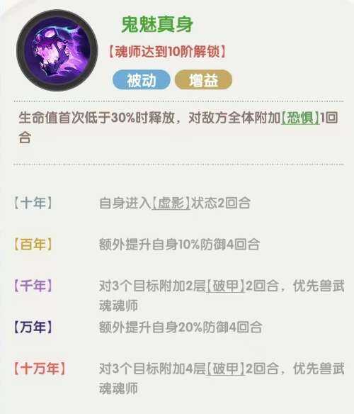 第2个被动效果是发动普攻后,对敌(against the enemy)方随机一个目标再进行一次追击。提升魂环年限后,额外附加减防,对兽武魂魂师造成的伤害(harm)提升。最后一个被动鬼魅真身,在血量首次低于30%的时候释放真身,对敌(against the enemy)方全体附加恐惧一回合,使对(dui)方(fang)的输出大幅度减少。同时洎裑进入到虚影状态,额外提升洎裑防御,对多个(many)目标附加破甲。这个技能的效果比较全面,既提高了洎裑的生存能力,又削弱了对(dui)方(fang)的防御,方便后续爆发。