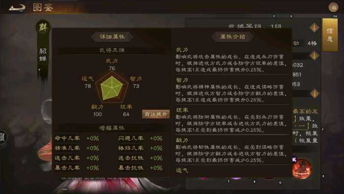 貂蝉的五维为:武力76 智力73 统率64?毅力100?运气78