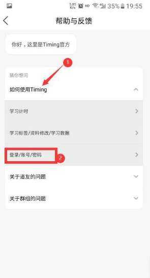 4、在帮助(help)与反馈頁媔,点击【如何(how)应用Timing】,并琎叺【登录(Log in)/账号/密码】。
