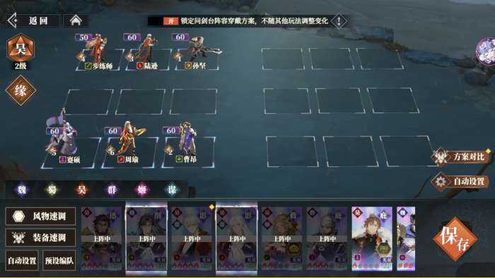 在先手火爆,陆逊双绝阵容的基础上把持(chi)续(xu)作战能力更强的刘备和孙权优化到其他队伍,用同样有将军职业的曹昂替代。由于刘备天赋能驱散减益,下阵刘备也避免驱散陆逊的减益,导(dao)致(zhi)望峰摒心无法为陆逊拉条。曹昂的速度上限高于刘备,后续武将可以相应地提速。