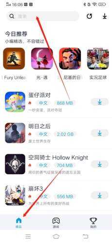 1、进入淘气侠APP后,首(shou)先(xian)点击“精品”,这里的游戏都是软件(software)每天为小伙伴推荐(recommend)的游戏,同时你还能点击上方的输入(enter)框去自己找需要的游戏。