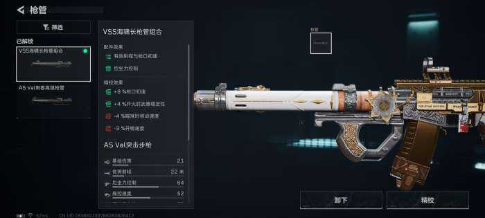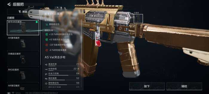 枪管、前握把、后握把、枪托全部(all)向右拉满。因为AS Val突击步枪的机动性高后坐力差的表现,所(suo)有(you)武器配件的精校全部(all)向右拉满可(ke)以提升枪械稳定性。
