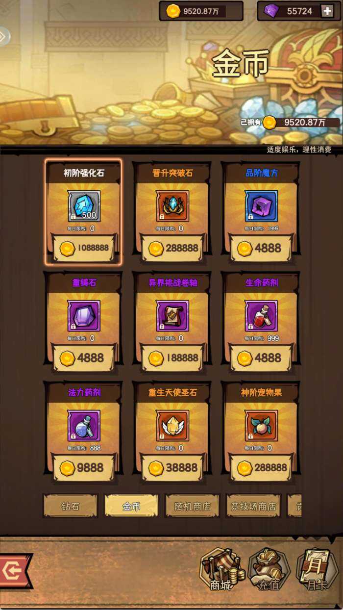 金币商城:必买--强化石,突破石,异界挑战卷轴,宠物果(钱不够可(ke)以暂缓)。其他可(ke)以按需购买,每日刷新数量还是很多的。
