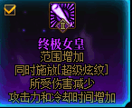 在改版之後因为没加强,秒伤沦为无色技能中的垫底水准。因(yin)此点满并且VP选择终极女皇会成为比較极端的爆发流选择,长线是(shi)不如其他无色的。