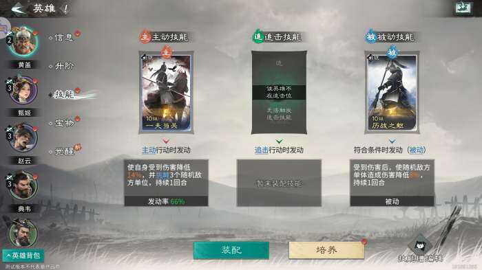 被动技能:推荐携带【历战之躯】,使随机敌方单体造成(cheng)伤害降低(reduce),配合主动技能【一夫当关】多次触(chu)发(fa),可以有效(youxiao)降低(reduce)敌军伤害。