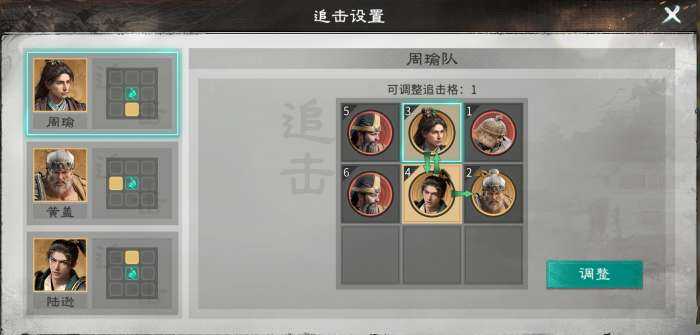 英雄站位为陆逊站在周瑜和黄盖的追击格上,这样不仅可以触(chu)发(fa)2次陆逊的追击技能,还可以同时触(chu)发(fa)陆逊的天赋技能【不意流火】,对敌方单体造成(cheng)伤害并施加2层灼烧。