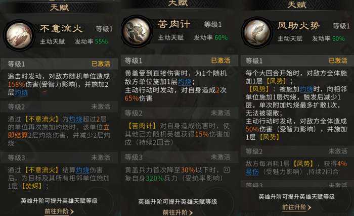 黄盖在前排抗伤可以触(chu)发(fa)天赋技能【苦肉计】,在给敌方施加灼烧的同时还能为队友提供增伤效果。