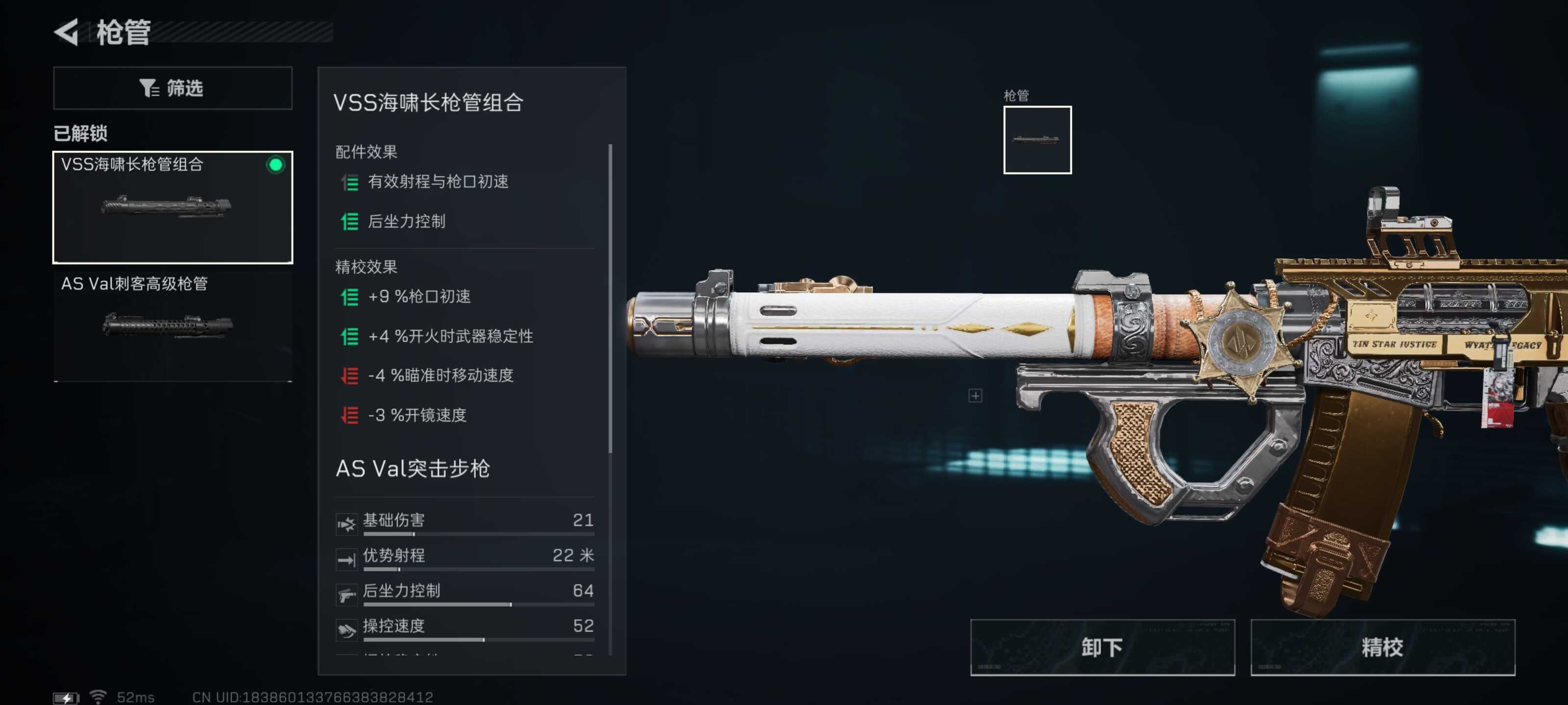 枪管选择VSS海啸长枪管组合。这个枪管对比另外一个(one)四连发的—AS Val刺客高级枪管,这个枪管更适(shi)应(ying)全面(comprehensive)战场的环境。