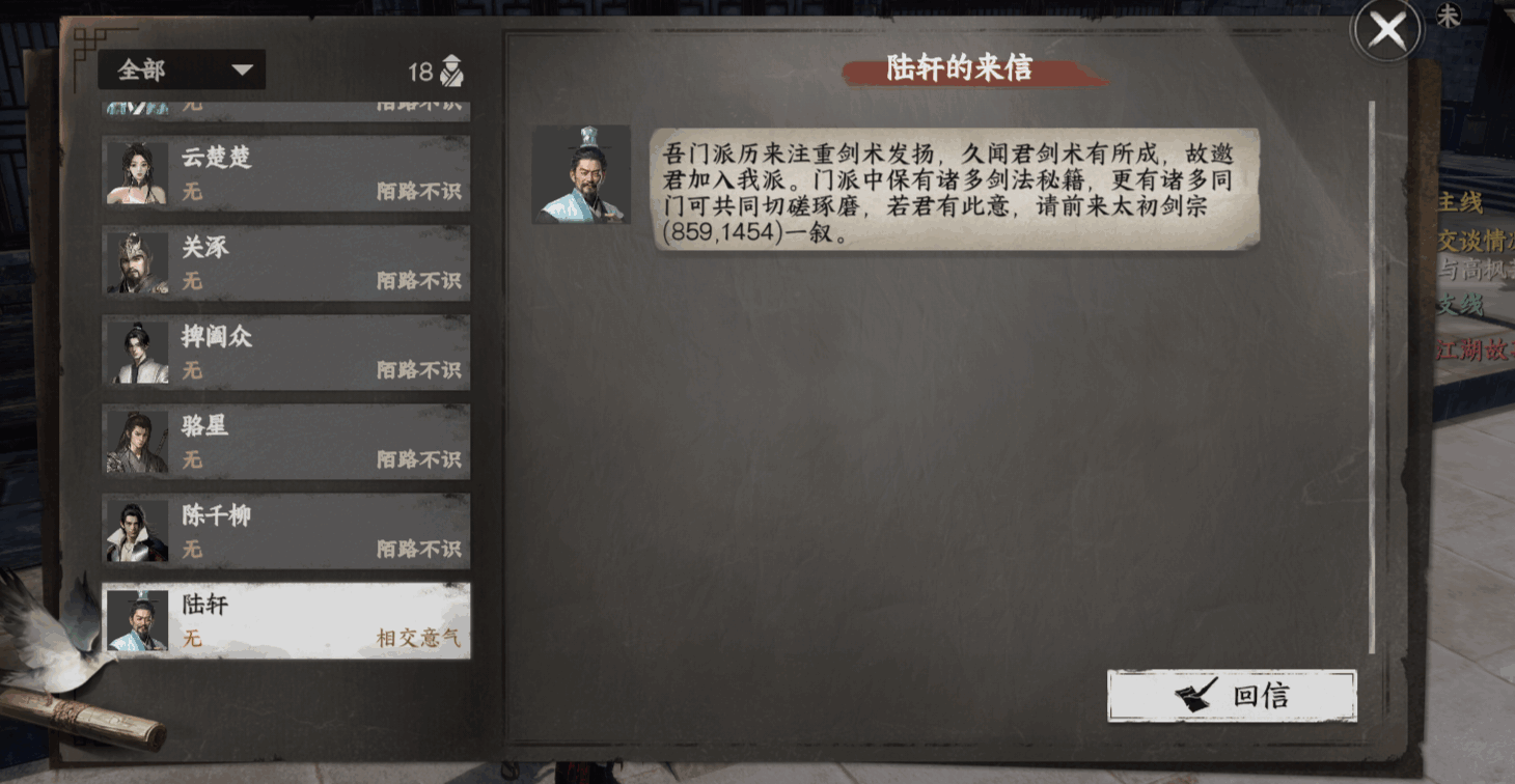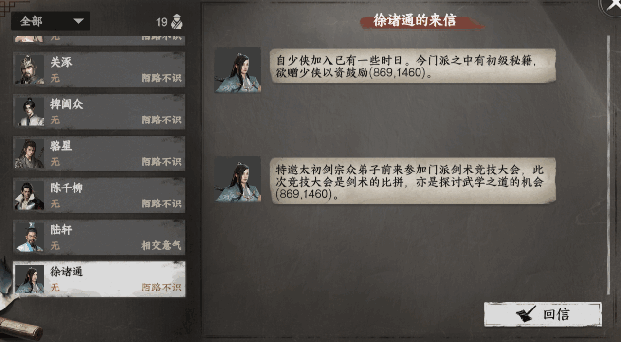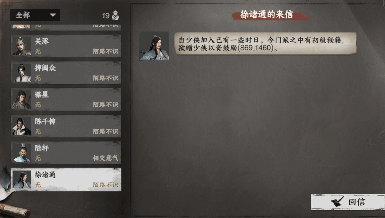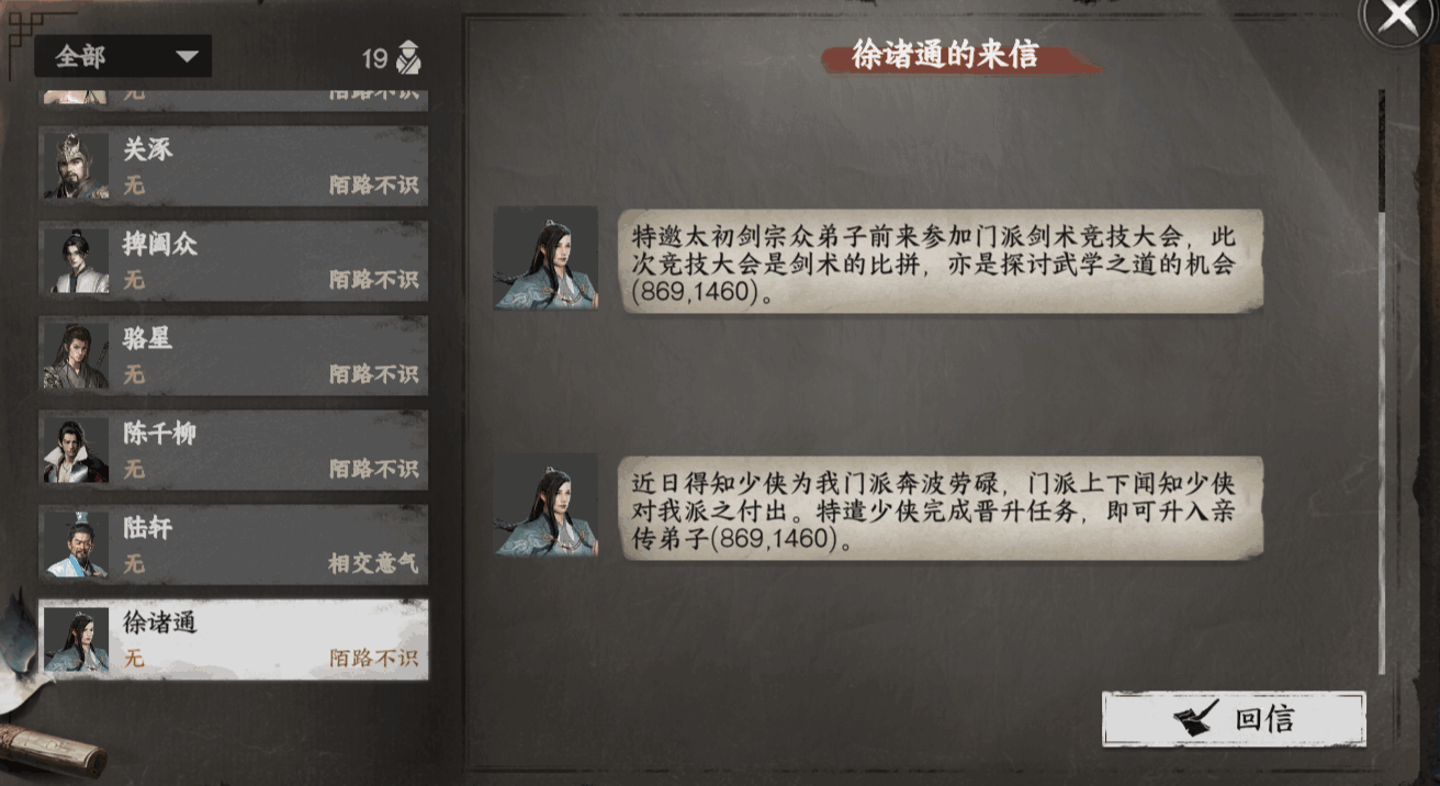 做悬赏任务将门派好感提升到50时收到徐诸通飞鸽交谈选择(xuanze)切磋