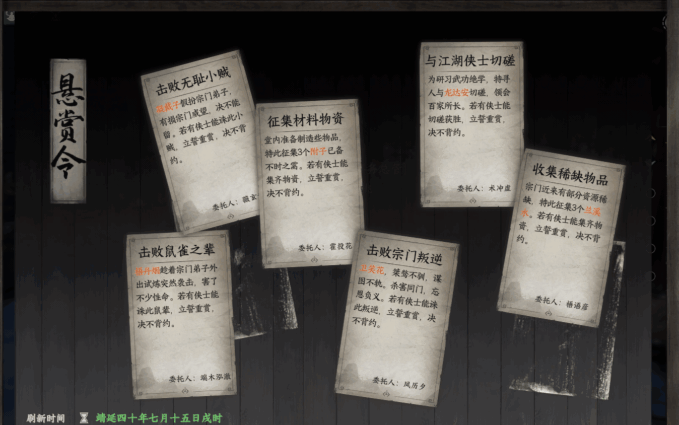 提交后获得门派好感,任务遇到的敌人和收集的材料会根据角色当前境界决定难度