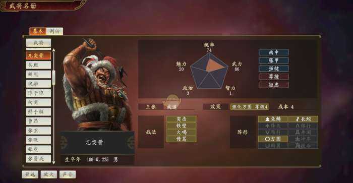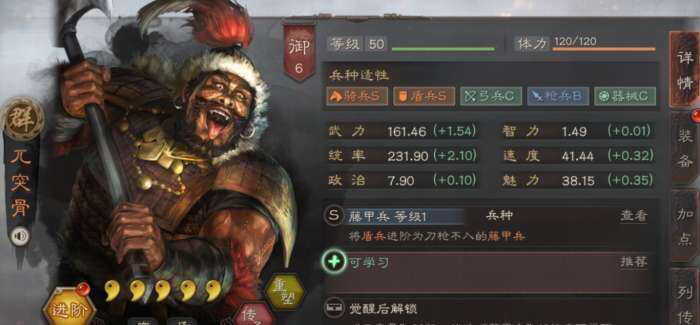 从属性上看,兀突骨统率成长非常高,属于典型的防守型武将。忠诚度为88,兵力基础约8000,所以在持久战中表现很好。更关键(guanjian)的是,他对于盾兵和藤甲兵两个(ge)兵种都有S级的适性,尤其是藤甲兵這一特性(texing),在面对物理(physics)攻击的时候可以大幅度减少所受到的伤害,可以说是物理(physics)队的噩梦。但是藤甲兵也有致命的缺点,就是害怕火攻或者灼烧类的战术。