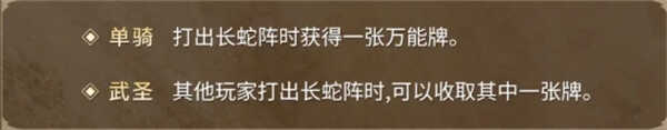 若关羽打出“长蛇阵”(点数連續)牌型,便如青龙偃月刀劈破敌阵,可(ke)获得一张 “万能牌”(能代除龙凤牌以外的任(ren)意(yi)牌);当其(qi)他人打出长蛇阵牌型时,关羽可从中(zhong)任取一张加(jia)入咱的手牌。
