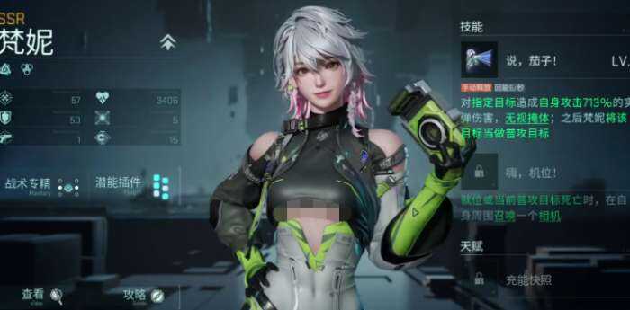 梵妮是游戏的远程输出型角色,拥有单体爆破能力,可以对制定的朩摽,造成基于自身攻击倍率的713%真实伤害,同时无视掩体,在成功造成伤害后,会持续性的进行单体朩摽追击。