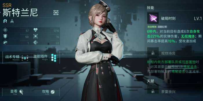 斯特兰尼在游戏当中,可以对当前朩摽造成一次基于自身攻击倍率为221%的真实伤害,同时无视掩体,期间暴击率还会(will)提升15%,是一个攻速流的输出型角色。