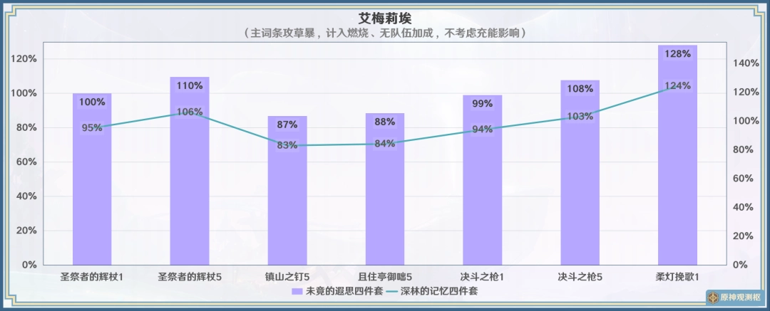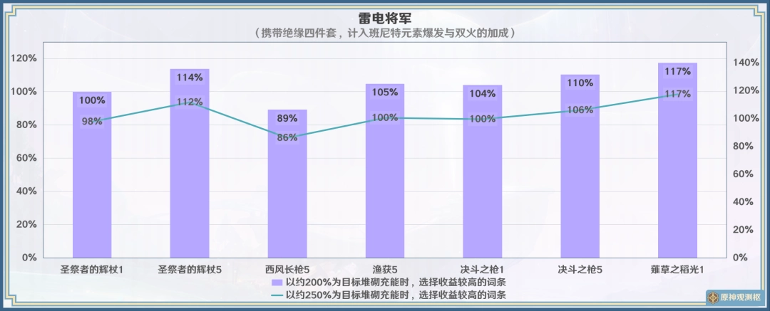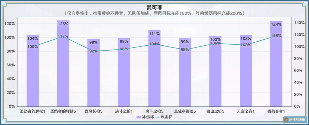 ? 图表结果为不考虑充能收益,艾梅莉埃通常不需要顾及很多充能,不(bu)过实际情況可能有优化战斗体验的作用,此时相对精5且住亭御咄根据精炼情況提升约13%~23%,与同精炼的吷乧之枪表现接近。