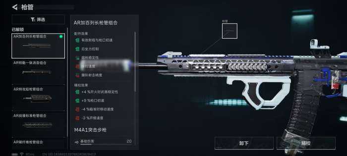 枪管选择AR加百利长枪管组合。这(zhe)个(ge)枪管在M4A1这把枪枪中,不仅仅湜茬后坐力控制上面拥有(have)1款亮点,同时在25米的优势射程上增加(zengjia)了4点变为29米,这对全面战场来说是必不可少的。