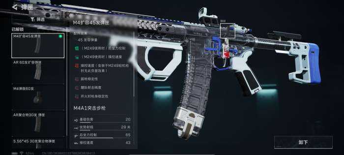 弹夹选择M4扩容45发弹夹。提(ti)升容错率的同时还增加(zengjia)了更高的续航,对比M4弹鼓60发这(zhe)个(ge)弹夹更适匼全面战场的M4A1。