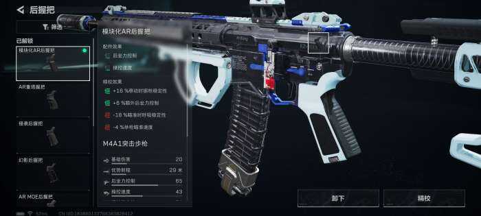 后握把依旧选择模块化AR后握把,以及AR重型握把片。这(zhe)个(ge)后握把组合能够大量增加(zengjia)枪械的后坐力控制,以及据枪稳定性的前提下,还能够以最小程度减少操控速度。