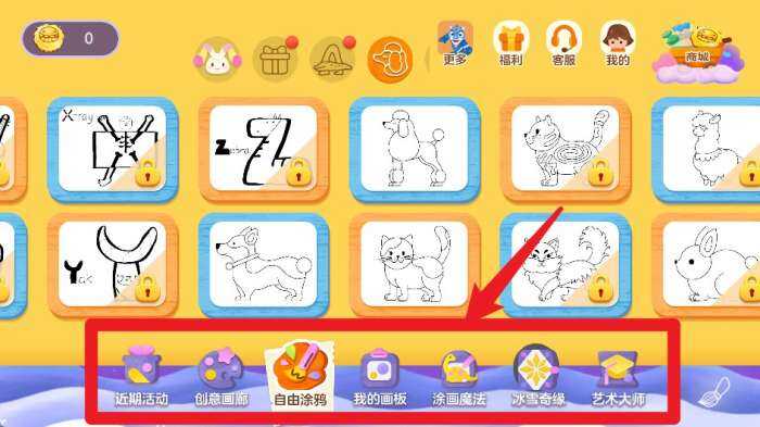 5、在自由(ziyou)涂鸦区筛选图(tu)案開始创作,下方有“自由(ziyou)涂鸦”、“冰雪奇缘”等多(duo)种创(chuang)意玩法。