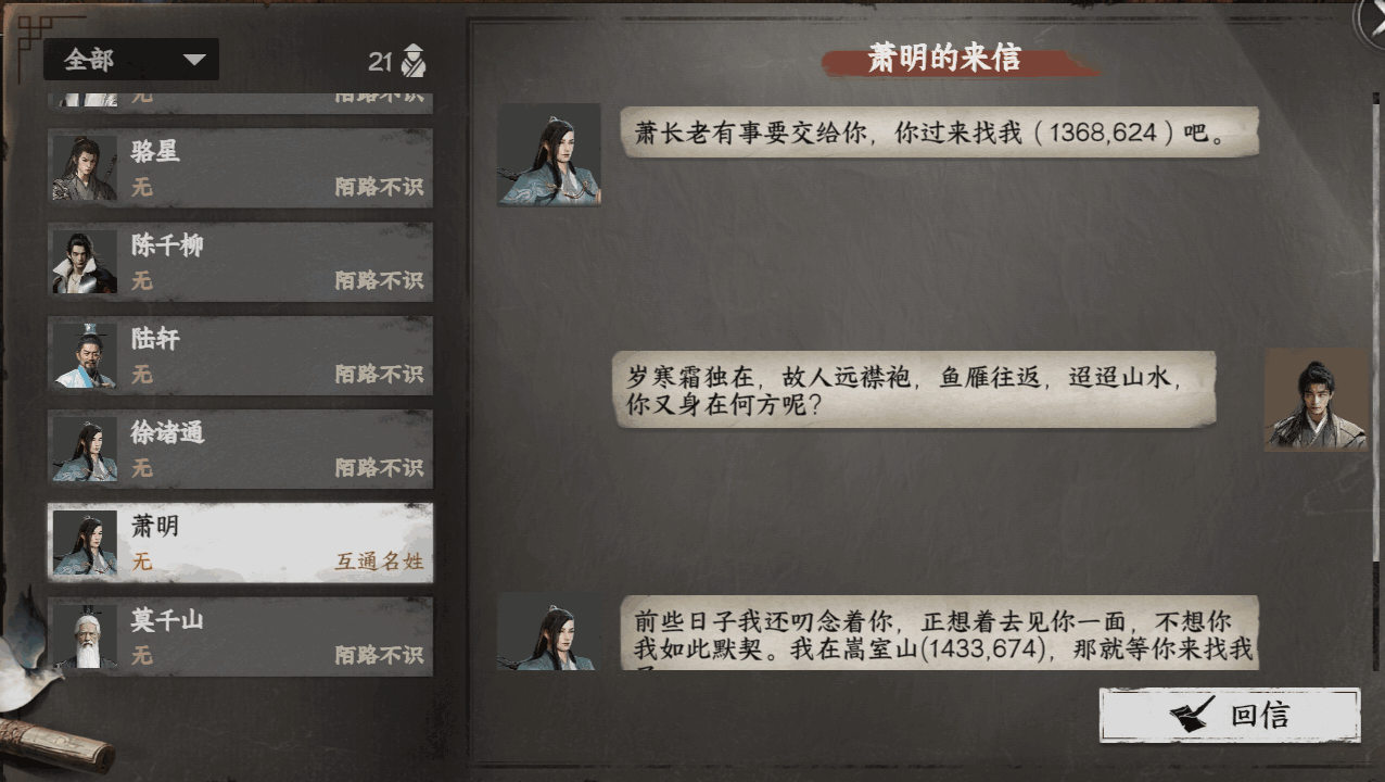 做悬赏任务将门派(menpai)好感提升到25时收到(receive)萧明发来飞鸽,如果不在飞鸽里的位置可以(yi)回信询问位置过去找他