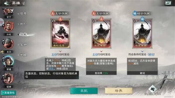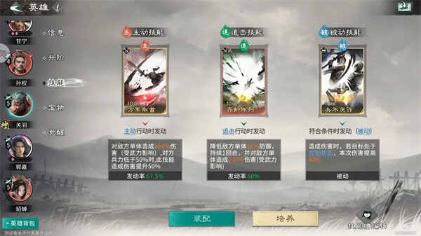 当前(current)郭嘉没有踩追击格无法发动追击技能,如果当郭嘉品质到达炼彩时,推荐将追击技能修改为主动技能,携带上兵无常势,從而获得更暴力的输出效果。