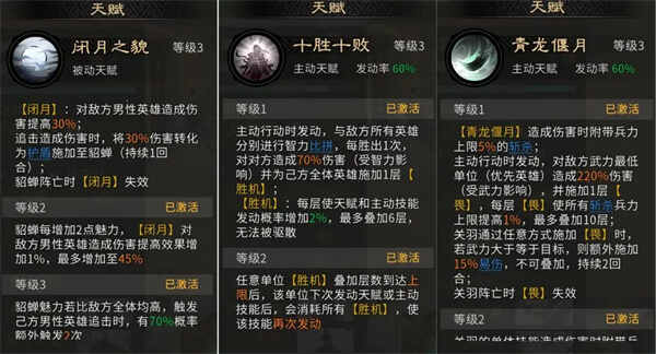 貂蝉自带天赋【闭月之貌】为关羽施加【闭月】效果,对敌方男性英雄造成伤害最高提升(promote)45%。若貂蝉魅力(li)比敌方全体均高,则有概率使关羽额外触发两次追击技能。