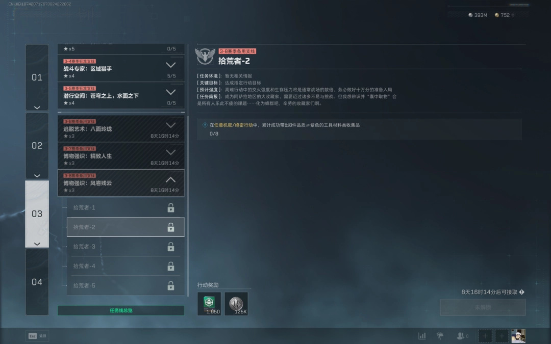 1、任务目标:在任意机密/绝密行动中,累計成(cheng)功带出8件品质≥紫色的工具材(cai)料类收集品
