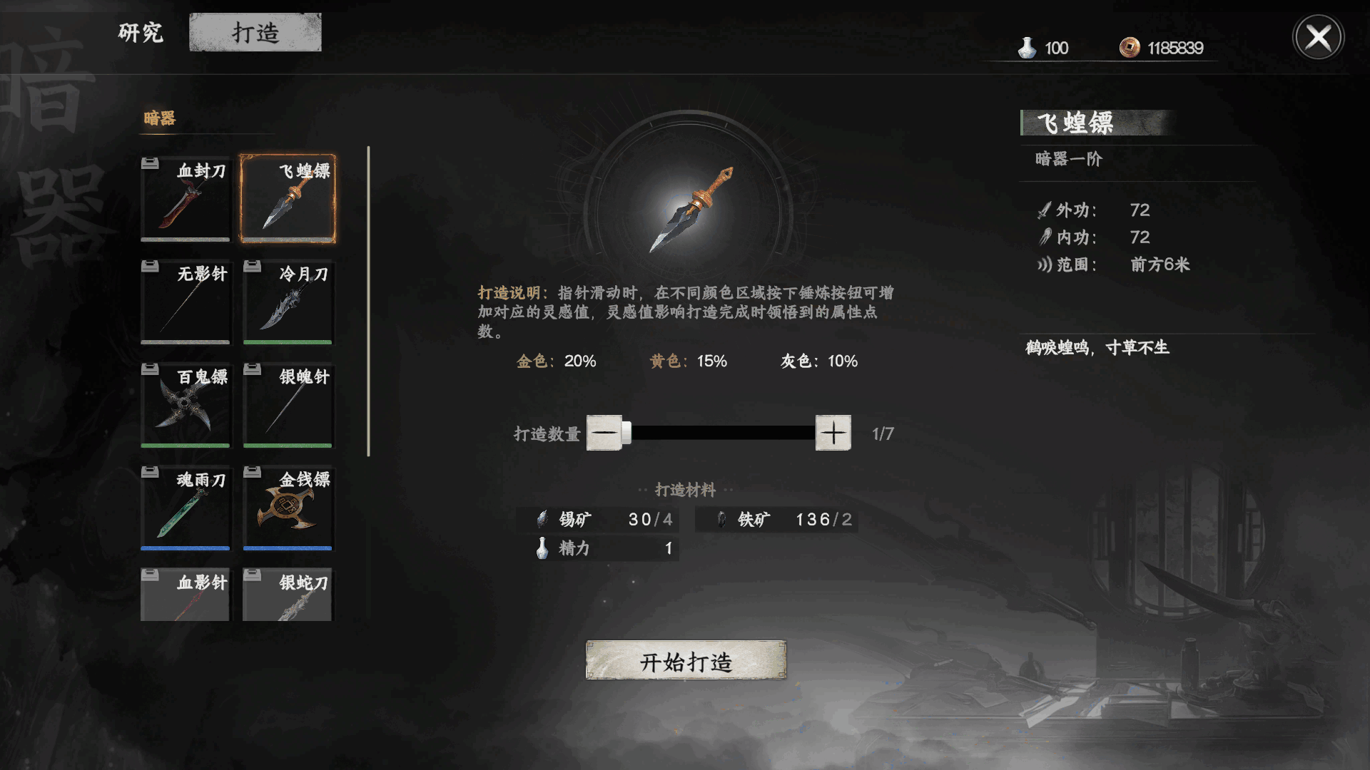 三(san)种(zhong)属性只需要在铁匠铺购买(mai)矿石然后一直打造飞蝗镖刷属性到可以研发下一阶暗器晋升身份(identity)