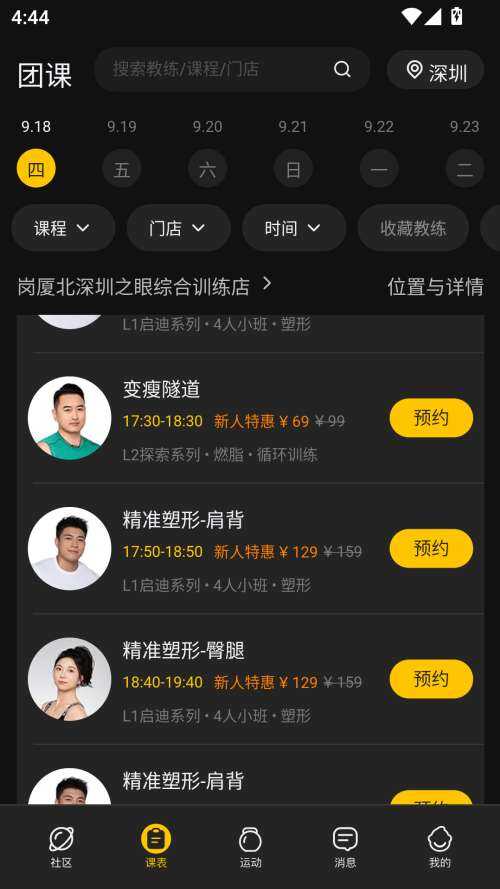 2、進入主界面(interface)点击(ji)课表功能,可按课程类(lei)型或门店筛选合适内容(neirong)。