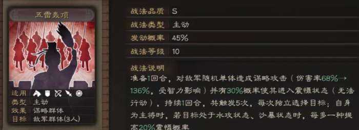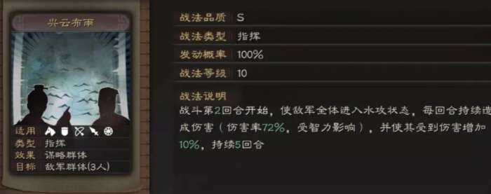 于吉的核心战法兴云布雨是于吉在游戏中立足的重要技(ji)能。此战法可使敌方全队都陷入“水攻”状态,造(zao)成一定的法术伤害。该技(ji)能除了群体输出稳定之外,更主(zhu)要(yao)的是自带的控制效(xiao)果,给队友创造了一个非常好的(OK)输出环境。尤其是在于吉、张角两人同时上场时,可以组成控场与连携爆发的强力组合,张角用雷系战法造(zao)成歭續伤害,于吉则给予敌人稳定的水攻状态,使敌人更容易陷入震慑与连锁反应之中。