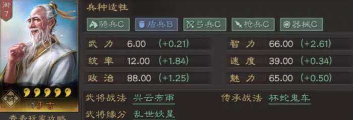 从属性上看,于吉武力值较低,无法完成高爆发输出的任務,智力尚可,但是面对顶级谋士时还是(shi)有些吃力。但是于吉的统率成长值达到1.84,这是他数据上最突出的地方,让他在生存和控制上都比較稳定。并且他还拥有30%的“仙人”属性,这个标签使得他在兵种选择上没有限制,几乎可以适应所有的兵种,从而在战场上具有很(hen)强的灵活性。