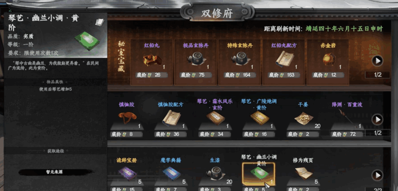 在游戏中提升琴艺的方法并不只有一种,第(di)一(yi)种是在游戏中比较常见的一种,就是(that is)可以搜集和琴艺相关的书籍,在游戏者们将书籍进行学习之后(zhihou)会逐渐增加琴艺,那么我们该获得哪些书籍才能够(Be able to)提升情谊呢,这就不得不提到我们的幽兰小调,要知(zhi)道幽兰小调是一个系列性的书籍,他并不是有一卷,一共有五卷,这五件幽兰小调都可以分别使用给游戏者的琴艺直接(zhijie)增加五点属性,但是需要注意的是它每一卷都只可以使用一次。