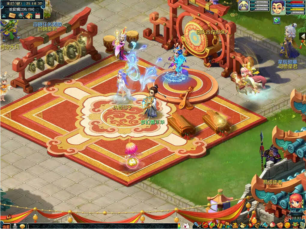 鼓音震震,仙乐飘飘,受唐王邀请,三界最著名的乐师们齐聚长安,举办了盛大的仙乐游园会。少侠可前往长安城(232,161)或(440,212)的舞乐班舞台,找执音仙子或其他乐师参(can)加各式各样有趣的互动小游戏哦!