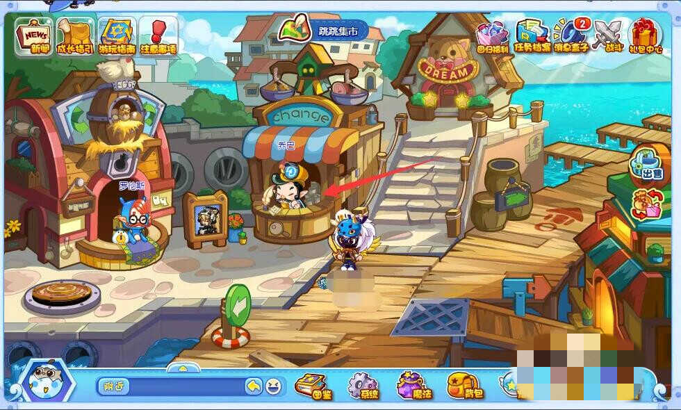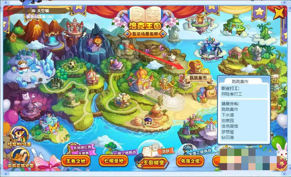 详细(detailed)答案(an):第一步:打开地(di)图(tu),切换(huan)到王国地(di)图(tu),找到(zhaodao)箭头所示的跳跳集市点(dian)击进入。