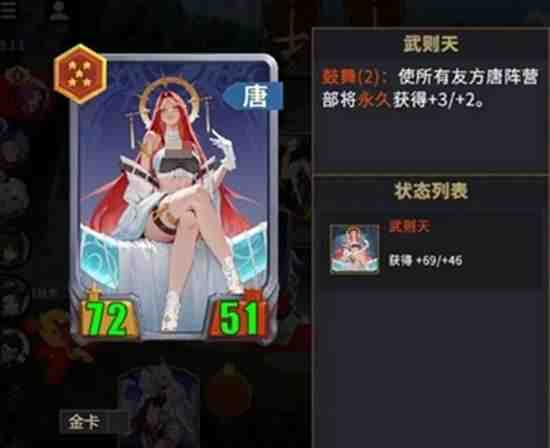 武则天是属性增幅核(he)心,友方累计两次攻击前会觸發鼓舞效果,为所有唐阵营成员提供永久(jiu)加成,是一个越战越强的角色,能同时解决坦度和输出问题。