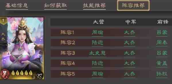 大营陆逊(主C)+ 中军大乔(辅助(zhu))+ 前锋周泰(坦度)