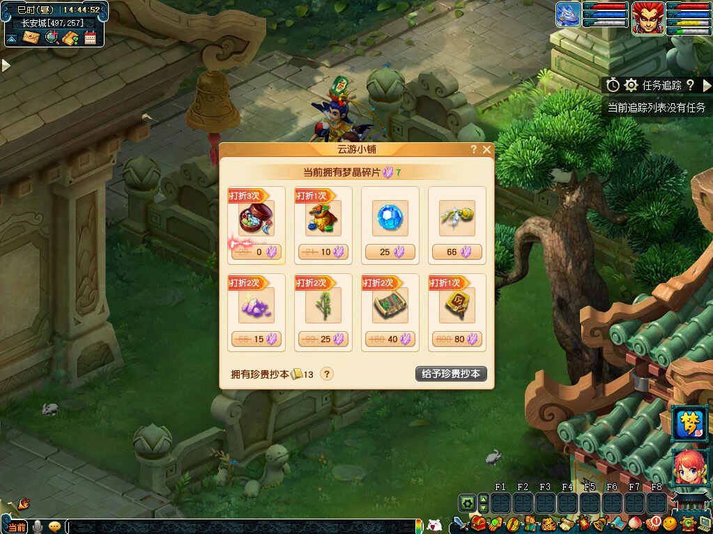 除祈愿抽取神兽外,来自佛国圣地的云游小僧也在收集梦晶碎片,他身处长安城(500,259),少侠们可以通过(guo)消耗一定数量的梦晶碎片,购买云游小铺中的珍贵物品。同时,云游小僧还在收集一种名为“珍贵抄本”的道(dao)具,少侠们可通过(guo)奇遇环任务、投放怪黄眉童子、破阵玩法获得(huode),每给予云游小僧一件“珍贵抄本”,云游小铺中的一件随机商品将会前进打折,每件商品最多打折3次,打折3次后无需消耗梦晶碎片即可取走对应商品。