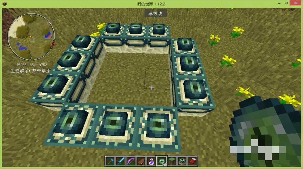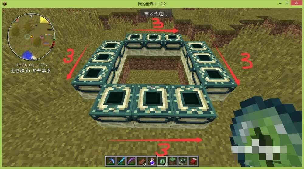然後我们(us)进入(ru)这个(ge)3*3的坑中,在这个(ge)坑中的边沿上摆放末地传送门,四个方向上各三个,注意,用户必须全程站在这个(ge)3*3的坑里摆放末地传送门,否则激活不了,激活不了,激活不了,重要(zhongyao)倳凊说三遍。