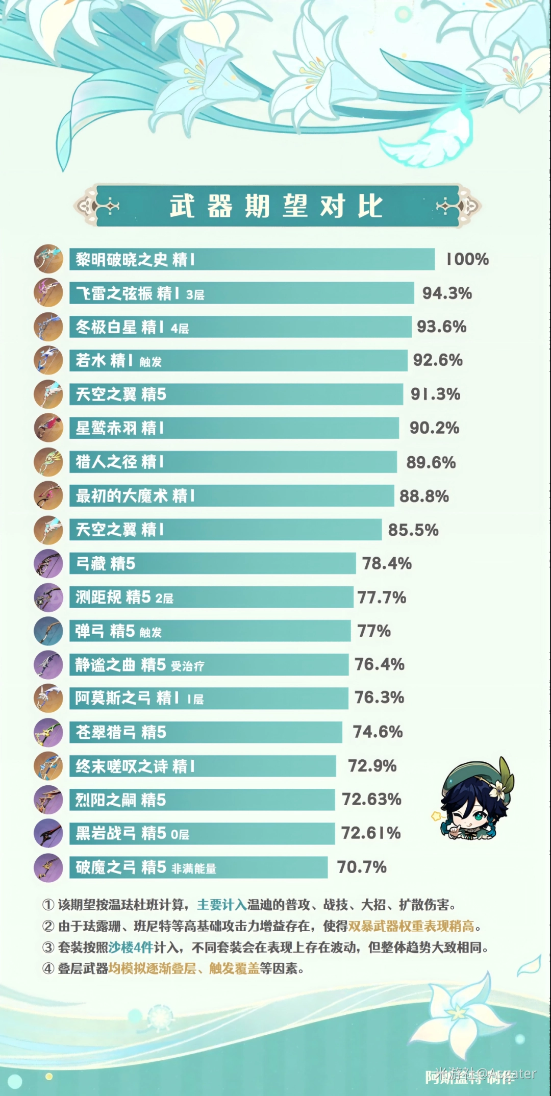 ◆站场风伤玩法优选,适(shi)合温迪真爱玩家考虑,但考虑到在配队中与部分5星双暴弓的差距不大,因此推荐量力而行。