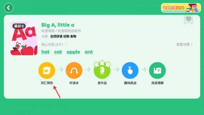 3、选好绘本后,会进入学习页面,我们先点(dian)击【词汇预热】按(an)钮(niu),提前熟悉绘本里的核心单词,为阅读做准备。