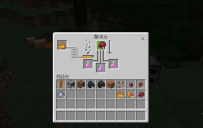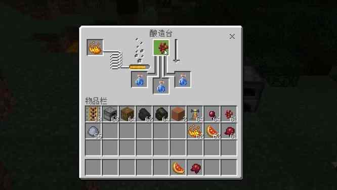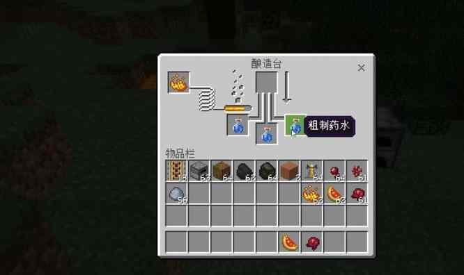 1.打開酿造台,放上烈焰粉,放上三瓶水,再放上下届疣,僦浍合成三瓶粗制药水。