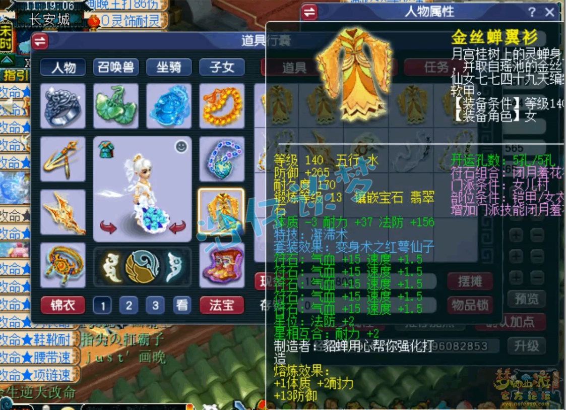 140级带凝滞术的红萼仙子套女衣,熔炼后减2体、加39耐,打了13锻翡翠石。
