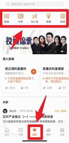 2、在投顾页面可进(jin)入(ru)直播、内参、仙人涨、锦囊等栏目,观看(guankan)專家直播讲解,获取专业的投(tou)资建议与实时行情分析。