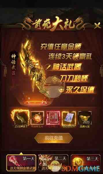 2、接着来个任意金额首充,只要充值任意金额就(jiu)能获得神话武器,刀刀秒怪,永久保值!
