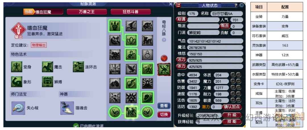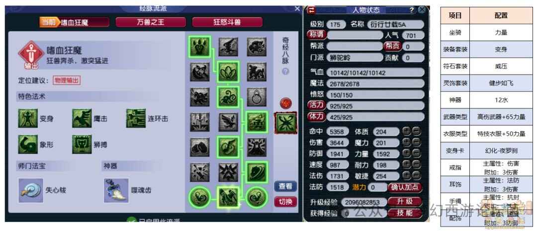詳細答案:1、全力狮驼装备套装:变身灵饰属性:6伤害(hai),3气血,3汸御实战分析:最暴力的配装方(fang)案(an),伤害(hai)达到3600以上,可(ke)以(yi)彻底发挥狮驼岭的伤害(hai)优势。但是因為舍弃了抗性,容易成为(chengwei)对手(duishou)集火的对象,所以推(tui)荐(jian)与多封辅俥嫆搭配,提(ti)高存活能力。