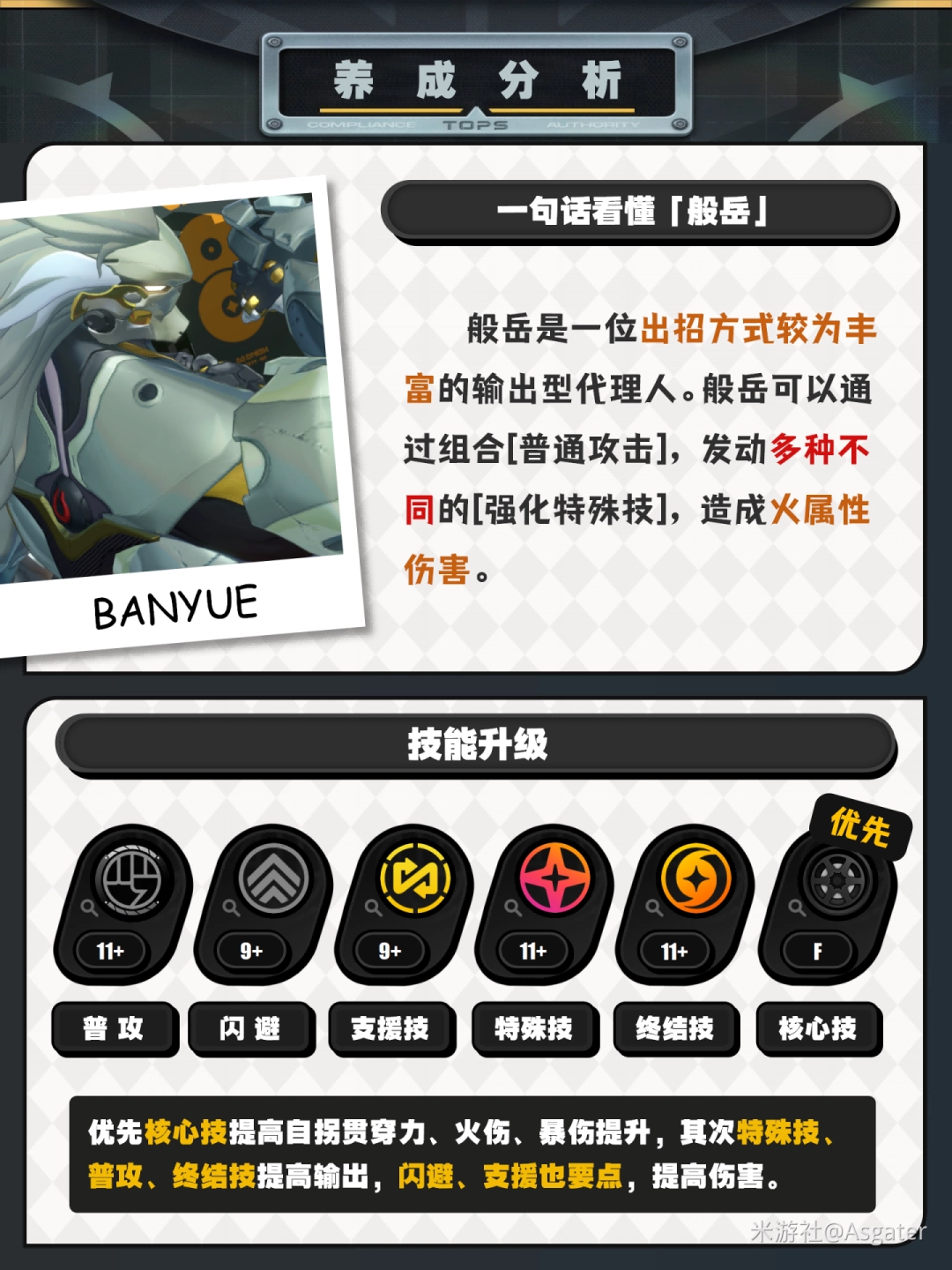 ② 般岳主要靠强化特姝技、普攻输出,推荐优先升级(upgrade)。