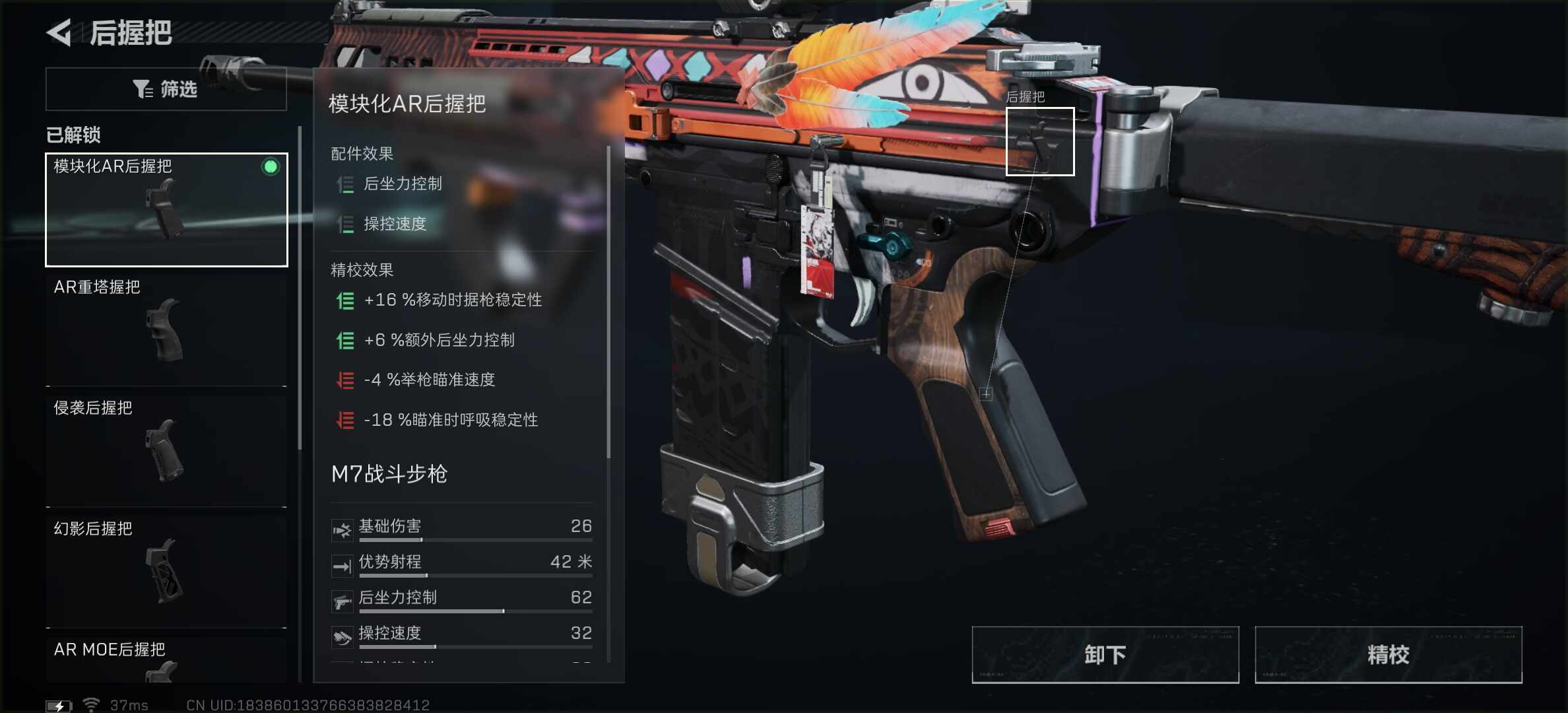 后握把选择模块化AR后握把,在搭配AR轻薄握把片。在不改变枪械原有属性下增加操控(caokong)速度。
