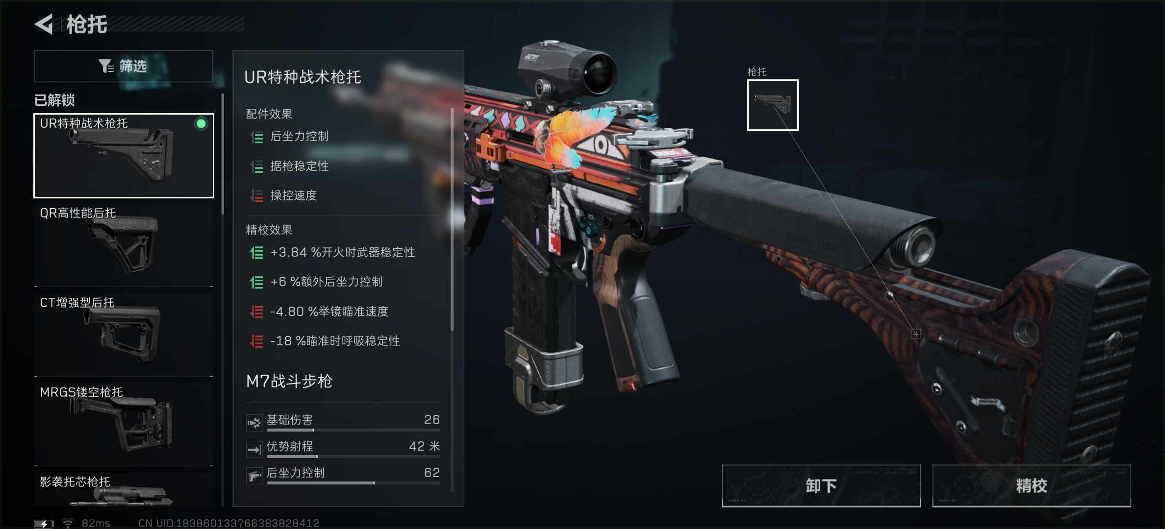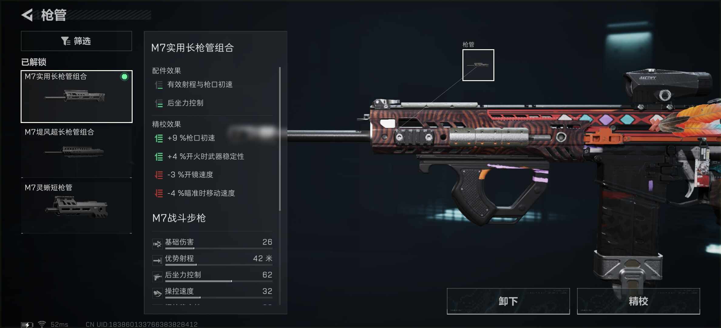 枪管选择M7实用长枪管组合。对比堤风长枪管组合,这个(zhege)枪管更切和这套配件可以(keyi)在保持机动的情况下增加射程以(yi)及后坐力控制