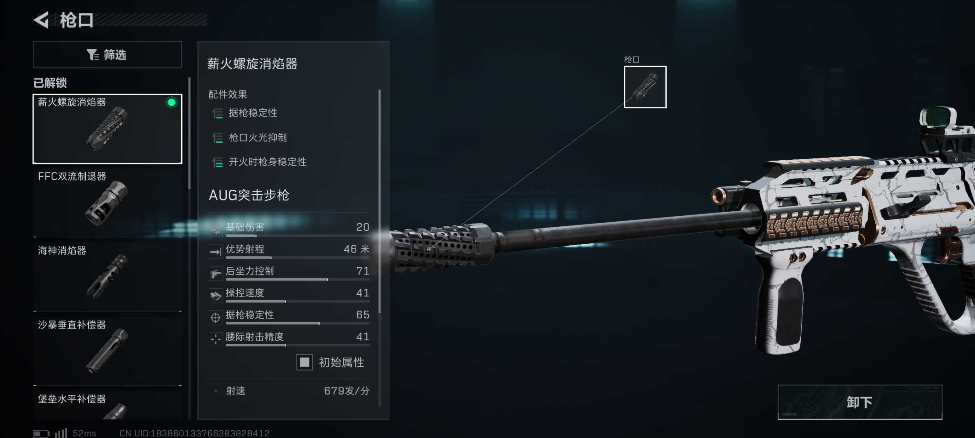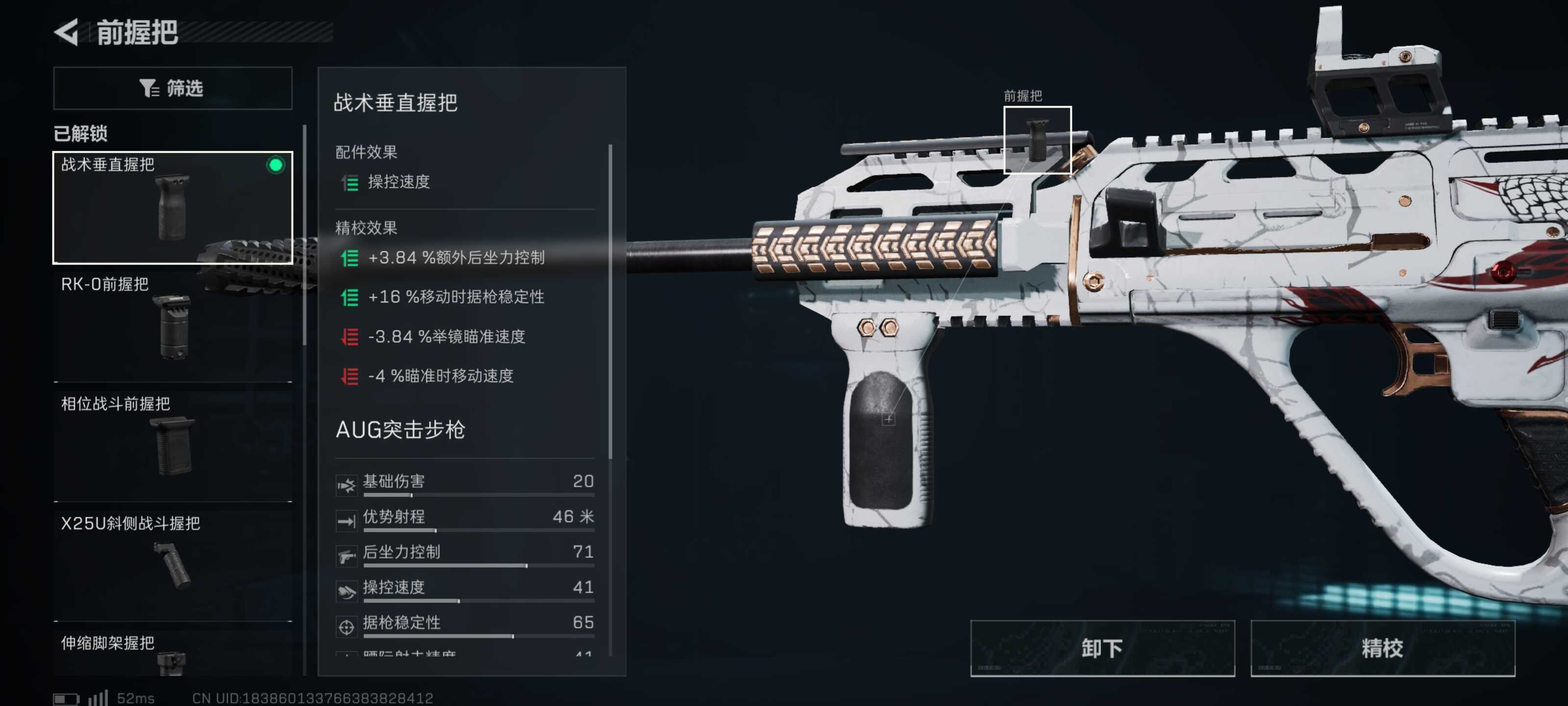 枪管、前握把、枪托垫、托腮板全部都向右拉满。在保留(reserve)AUG本身的机动性的前提下,进一步提(ti)升(sheng)AUG的稳定性,能使在实战过程中拥(yong)有更加亮眼的表现(biaoxian)。