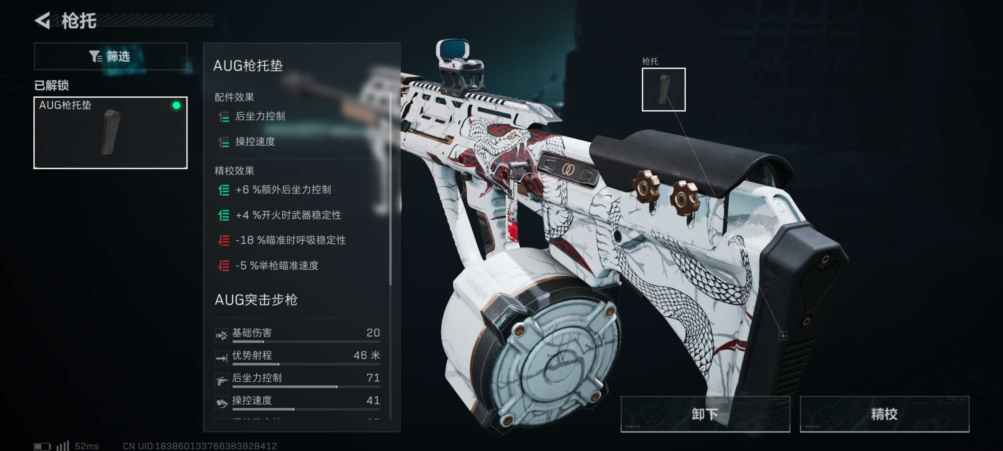 枪托选择AUG枪托垫。AUG是属于一体枪械,枪身和枪托是一体,带上枪托垫可以(yi)有效增加AUG的操控速度以(yi)及(ji)后坐力控制。